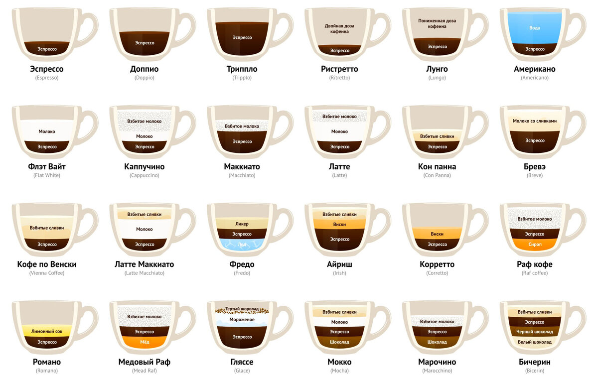 - Бичерин – кофе по-турински, состоящий из 3 слоёв: горячего шоколада на молоке, эспрессо и взбитых сливок. Сверху кофе украшают тёртым горьким шоколадом и мятой.