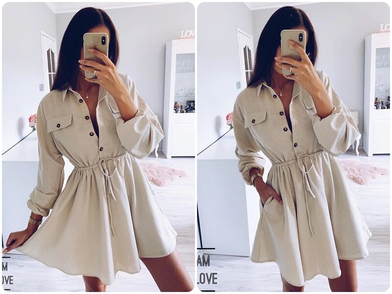 Короткое платье-рубашка с рукавами фонариком.