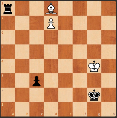 Очередная шахматная задача, автор А. Сочнев, 1983 год. Черной пешке 2 хода до ферзя, а белой один (но перед ней белый слон). На первый взгляд может показаться, что черные легко выигрывают. Но белые начинают и добиваются ничьи. Следующая задача Хитрый мат тут>>>