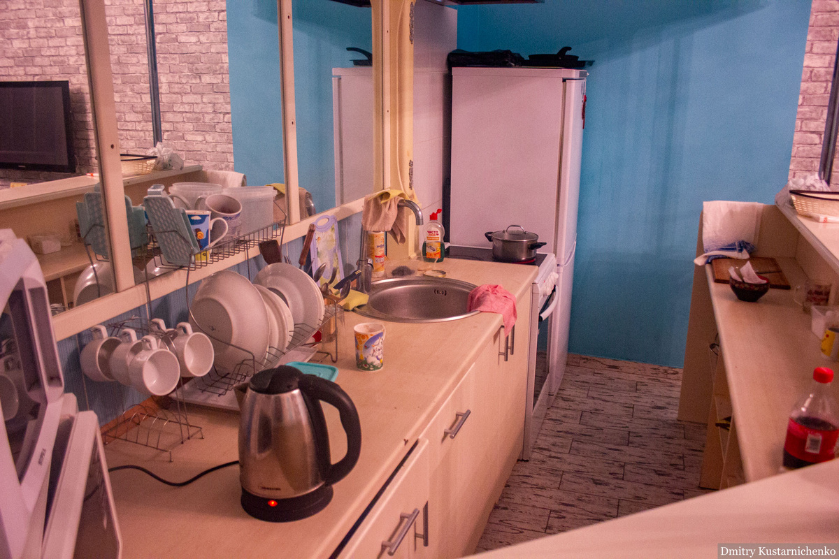 Кухня нормальная, есть 2 микроволновки, чайник, электроприта и даже духовка. Но маловата - более чем одному человеку в единицу времени готовить уже будет тесно. Ну, двум максимум.