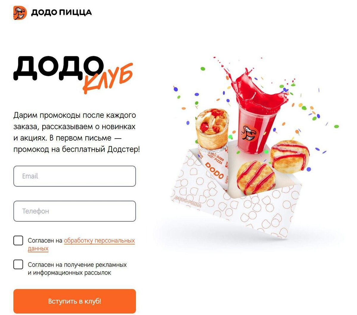 1. Переходим на сайт club.dodopizza, вводим почту и телефон;