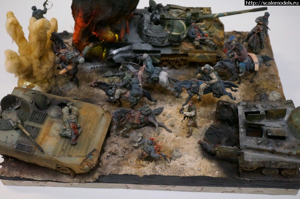 Я давно планировал сделать диораму на тему начала войны в Афганистане, но никак не мог придумать сюжет, долгое время (8 лет) сюжет перестраивался и я всё откладывал. В итоге в 2018 я посмотрел фильм Кавалерия и понял, что это то, что нужно. По своему воплощению диорама получилась уникальной, так как нет ни одной фигуры бойца спецназа или бойца северного альянса на коне. Пришлось делать самому. За основу были взяты фигурки Советских казаков времён Великой Отечественной войны (набор Звезда 2 упаковки), они и стали основой для миниатюр бойцов Альянса и спецназа. Полная переделка коробочных казаков с нуля дало очень положительный результат. Использовалось только напильник и двухкомпонентная шпатлёвка Tamiya. Бронетехника для диорамы это наборы: Скиф Т-55АМ и БМП-1 от Звезды в масштабе 1/35.