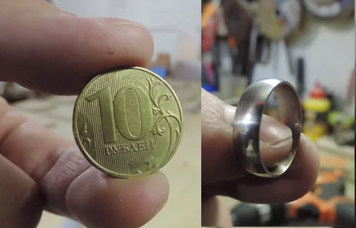 В детстве на уроках труда я делал такие кольца и дарил их своим одноклассницам. Они получались не очень ровными несмотря на то что я старался. И вот я стал старше и решил попробывать сделать это кольцо еще раз. ну уже в своей мастерской. Приступим. Взял 10 рублёвую монету. Желательно чистенькую и не помятую. так же если палец на которое будет кольцо побольше , можно взять 5 рублёвую монету. Находим ровную поверхность, не то появятся неприятные и некрасивые вмятины. Далее берем молоток и приступаем к часовой долбежке) монеты. В начале лучше обстукивать несильными ударами, а то монета будет либо овальной либо еще хуже согнётся (неприятное зрелище). Ах да. Лучше бери молоток полегче. если не хочешь стать одноруким бодибилдером. Примерно такие стенки должны получиться . желательно не делать слишком тоненькими. Самая неприятная часть в изготовление кольца. Так как когда уже практически сделал отверстие стенки могу согнуться от того чем вы держите кольцо чтобы оно не убежала. Берем сверло п