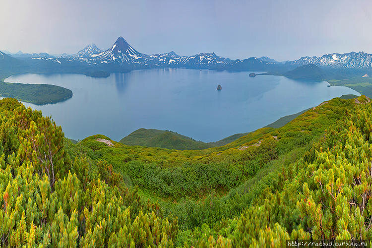 Вид на курильское озеро с сопки "Домашняя" На дальнем плане вулкан Ильинский. Курильское озеро считается самым густонаселенным медведями местом в России. Впервые я побывал там во второй половине июля 2011 года, и это было не самое лучшее время чтобы увидеть большое скопление медведей на одном месте.