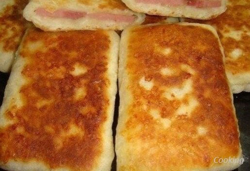 Тёртая на тёрке ветчина (колбаса, сосиски) Добавляем в кефир соль, сахар, соду и хорошо перемешиваем. Добавляем тертый сыр и муку. Перемешиваем. Тесто разделяем на колобки, раскатываем небольшую лепешку, кладем начинку (у меня - ветчина). Можно положить сыр другого вида, тоже очень вкусно. Соединяем края и немного раскатываем. Жарим на предварительно разогретой сковороде на рафинированном масле c 2-х сторон на среднем огне, накрыв крышкой. Приятного аппетита!