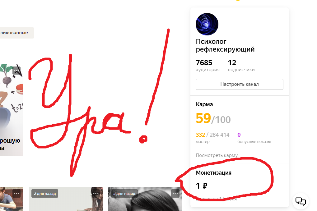 Этот пост пишу в большей степени для себя, чтобы отметить важное событие: выход на монетизацию и первый заработок. Хочу сказать, что писать я стала здесь не ради заработка (я почитала и поняла что заработать тут нужно еще ой как постараться), но я давно пыталась найти удобную площадку для выражения своих мыслей. Даже сайт пробовала делать, но не потянула - не хватает технических знаний. А здесь всё просто и понятно, очень легко и удобно и бонусом к моему удовольствию монетизация) Первую статью я написала 2 июня, таким образом моему блогу примерно 1,5 месяца. Еще мало подписчиков, небольшой охват, всего несколько статей, которые действительно читают и комментируют, Но когда я 15 июля увидела кнопочку о подключении монетизации, радовалась как ребенок!) Тут же заполнила заявление и уже 17 июля (через 2 дня!) монетизация на Яндекс Дзен заработала, а поскольку данные о заработанных кровных идут с отставанием в пару дней, то сегодня утром я увидела, что в первый день был заработан целый один