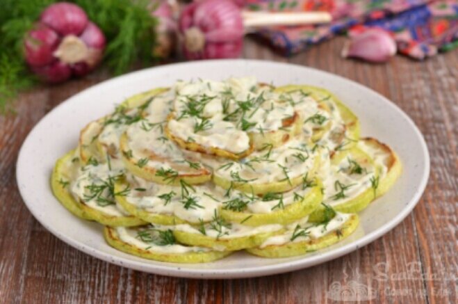 Ингредиенты 500 гр. кабачок 4 ст.л. майонеза 2 зубчика чеснока (большие) 3 веточки укропа 3 веточки петрушки 4 ст.л. растительного масла 2-3 щепотки кориандра (молотый) по вкусу молотый перец (черный) по вкусу соль Инструкции Приготовление начинаем с соуса. Он должен немного настояться, чтобы ароматы чеснока и специй раскрылись. В миску отправляем майонез. Укроп с петрушкой промываем, недолго просушиваем на кухонном полотенце, мелко нарезаем и выкладываем к майонезу. Большие зубчики чеснока пропускаем через пресс и добавляем в миску. Дополняем соус черным перцем, молотым кориандром. Кориандр всегда беру в зернах и измельчаю в ступке, он так получается ароматнее. Хорошо соус перемешиваем и настаиваем в холодильнике, пока обжариваем кабачок. Если для приготовления берете небольшие в диаметре кабачки, то нарезайте их на кружочки. У меня был довольно большой кабачок, поэтому я его нарезала на кружочки шириной около 1 см, и разрезала кружочки пополам. В сковороде разогреваем растительн