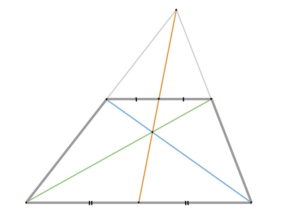 Докажите, что середины оснований трапеции общего вида, точка пересечения её диагоналей и точка пересечения продолжений её боковых сторон лежат на одной прямой.