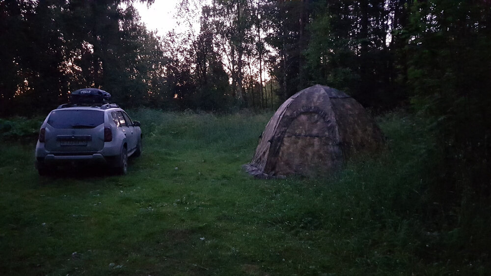 В общем, к вечеру мы добрались до Макромус. Подъездов к берегу там нет, только тащить все от стоянки которая находится у тур.базы. Потом поехали искать место для ночевки. Это оказалось тоже нелегко, съездов в лес к реке тоже нет, нашли пару съездов только, в одном тусили рыбаки, а вот второе было свободно, и то, пока ставили палатку, приезжало машины 4, видели, что тут все занято и уезжали.