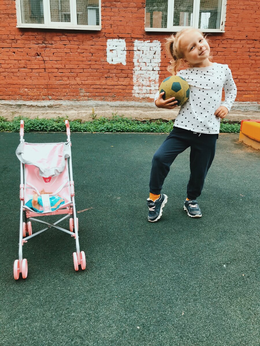 Младшая дочка тоже не прочь покатать машинки и побросать мячи, но вот к куклам, домикам и коляскам точно неравнодушна.