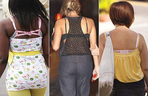 Часто летом мы видим на улицах такую картину, когда подростки, или женщины, или бабушки, ходят в черном бюстгальтере под белой футболкой. Или белье любого другого цвета, кардинально отличающегося от цвета одежды, которая сверху. И белье просвечивает сквозь одежду. Хуже этого ситуация, когда майка на спине провисает, и просто на пол спины выглядывает контрастный бюстгальтер. В таком виде девушки не стесняются ходить на работу, на собеседование, на экзамены. Понятно, что жарко, но существуют же какие-то эстетические рамки. Во-первых, если девушка одета опрятно, и у нее просто на плечах торчат лямки от бюстгальтера другого цвета, то это можно исправить несколькими способами. А вот если лень подбирать цвет белья под цвет просвечивающей одежды, это уже не исправить. Самое простое решение скрыть бретельки от бюстгальтера, предлагают нам сами продавцы белья – съемные прозрачные силиконовые бретельки. Некоторым они не нравятся, так как натирают в жару, давят, впиваются, рвутся, наконе