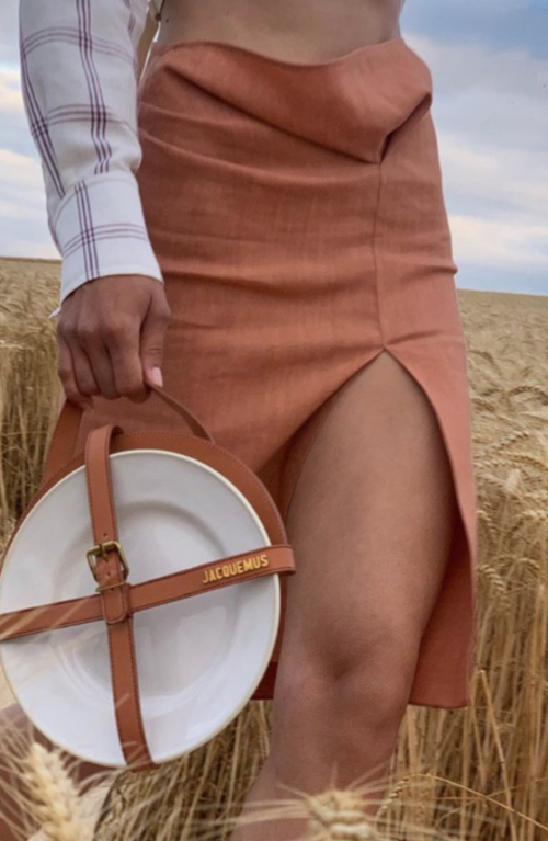 Симон Жакмюс снова вышел в поле. Однако пространство показа больше не пестрит лавандовым одеялом и подиумом цвета фуксии, как в рамках весенней коллекции прошлого года. В этот раз зритель погружается в очень вдохновленное и спокойное настроение поэзии. Добро пожаловать во французский прованс! Пшеничное поле в тандеме с пастельной гаммой коллекции создает вокруг атмосферу уединения. И напоминает о тех самых днях за городом: где только вы, книга и персики нежного цвета. Все это напоминает небольшой глоток свежего воздуха, будто пандемия с нами и не случалась. Многие люди, в том числе далекие от моды, отлично знают популярные работы Симона Жакмюса. Каждый видел фотографии гигантской соломенной шляпы и микро-сумки Jacquemus Chiquito, которую в инстаграме представляют как кошелек для кота. На показе весенней коллекции 2021 можно увидеть лишь миниатюрные клатчи, но кроме них на подиуме не появляется ничего экстраординарного. Коллекция L’Amour рассказывает о любви, об отдыхе и о природе. Она