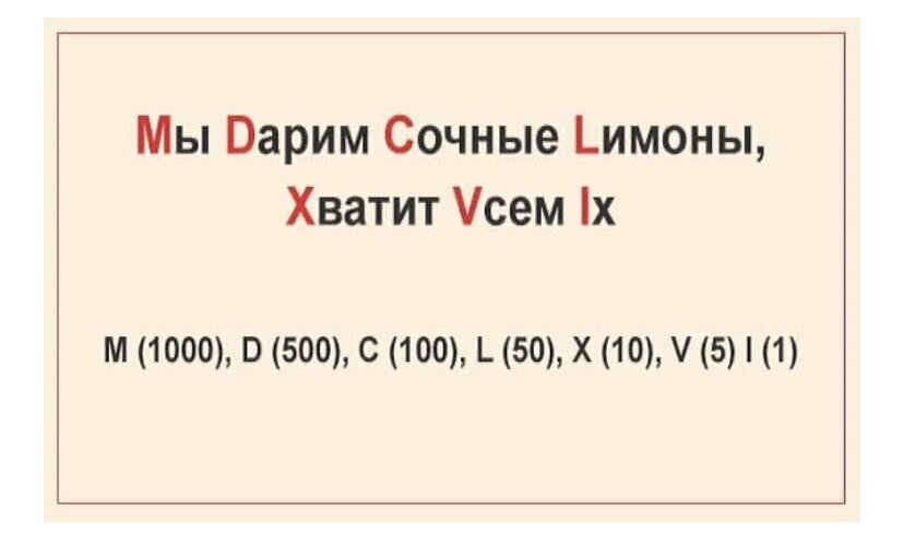 В школе римские цифры мы запоминали с помощью вот такой поговорки: