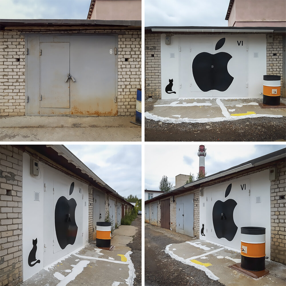 - окрашены ворота с нанесением рисунка. Он сразу впечатлил всех. По процессу я написал отдельный пост и снял видеоролик. Логотип немного расходится с оригиналом, но этого никто не замечает;