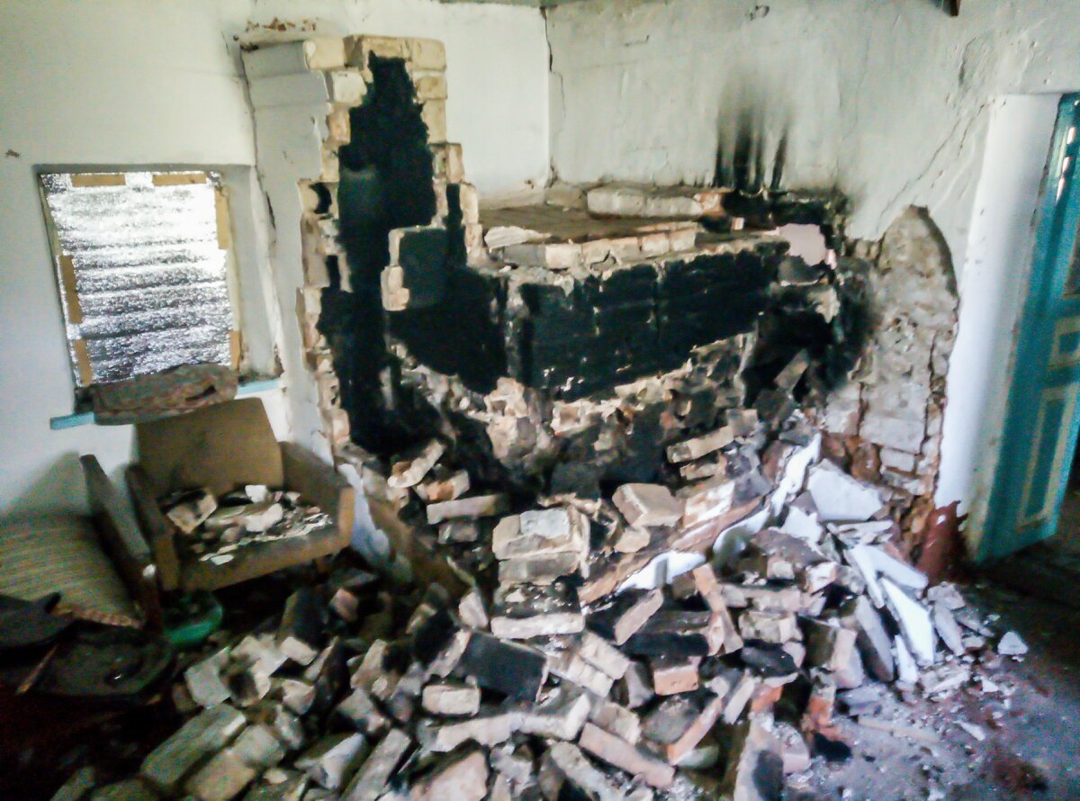 В предыдущей статье я вам показывал разрушенную топку печи, которая находилась в чулане где сени. Сама же печь с лежанкой была здесь, в жилой комнате. Правда, она уже была наполовину разрушена.