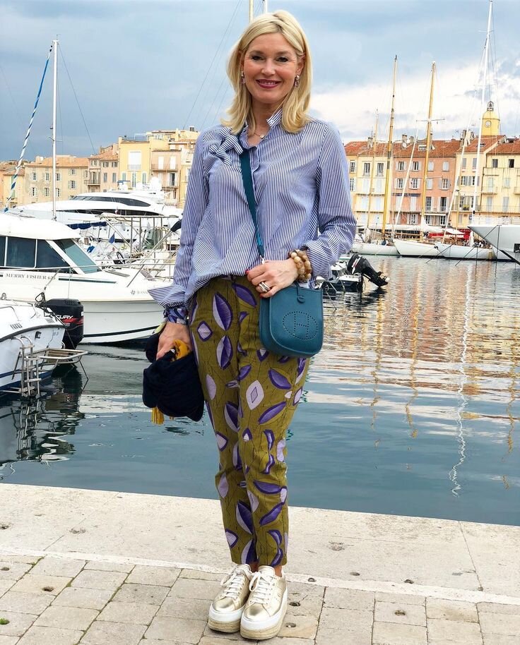Дополняем их бело-синей рубашкой в тонкую полоску, небрежно заправив её за пояс, и золотистыми кроссовками на толстой платформе. Осталось подобрать украшения в виде браслетов из натурального камня. И небольшую сумку цвета морской волны.