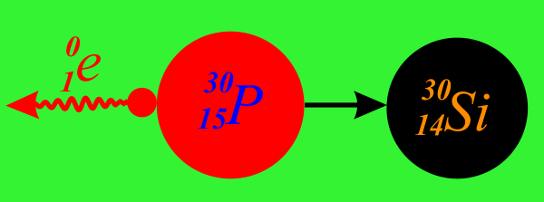 Период полураспада радиоактивного фосфора Р(15,30) равен 3 мин. Чему равна постоянная распада этого элемента? // Ремизов А.Н., Максина А.Г. "Сборник задач по медицинской и биологической физике", 2001 г. https://bookmix.ru/bookprice.phtml?id=84492 Рисунок. Схема распада фосфора-30. Продуктами распада являются позитрон и кремний-30, который в свою очередь является стабильным элементом.
