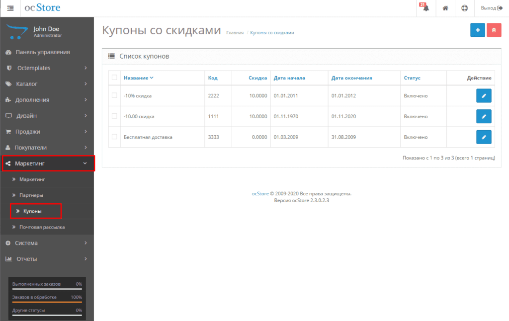 Купон (промокод) в CMS Opencart — это удобный способ стимулировать пользователей сделать покупку, получая скидку, введя определенный код, при оформлении заказа. Видеоинструкция Как создать купон в CMS Opencart Для того, чтобы создать промокод потребуется перейти в административной панели в «Маркетинг»-«Купоны», где будут показаны, все уже имеющиеся коды: Добавить новый следует кликнув на соответствующую кнопку в правом-верхнем углу. Далее заполняем: По завершении следует сохранить изменения. Изменить уже созданный свод данных можно кликнув на карандаш напротив названия. Как проверять отчетность Для того, чтобы увидеть, какое количество использований и скидок было получено следует перейти в административной панели «Отчеты»-«Продажи»-«Купоны». Также если подключена электронная коммерция для Opencart в Яндекс.Метрике, то можно использовать этот отчет для ознакомления со статистикой. Как использовать промокод в Опенкарт? Сделать это можно в разделе «Использовать подарочный сертификат». По