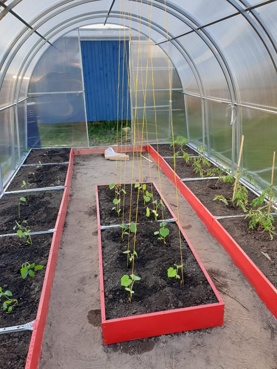 Посередине посадили огурцы, по краям - грядка с помидорами и грядка с перцами. С дорожками надо бы тоже что-то придумать, но пока так.
