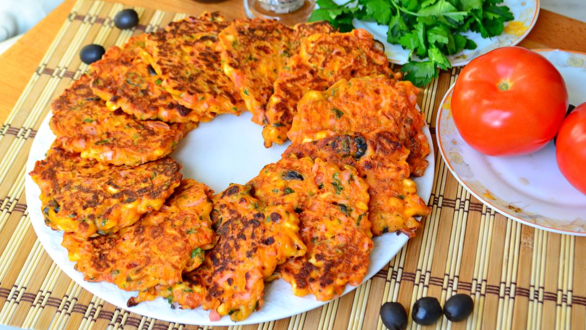 Вот так русские оладьи и итальянская пицца слились воедино. Подавайте оладьи с любимыми соусами, зеленью или помидорами. Приятного аппетита!