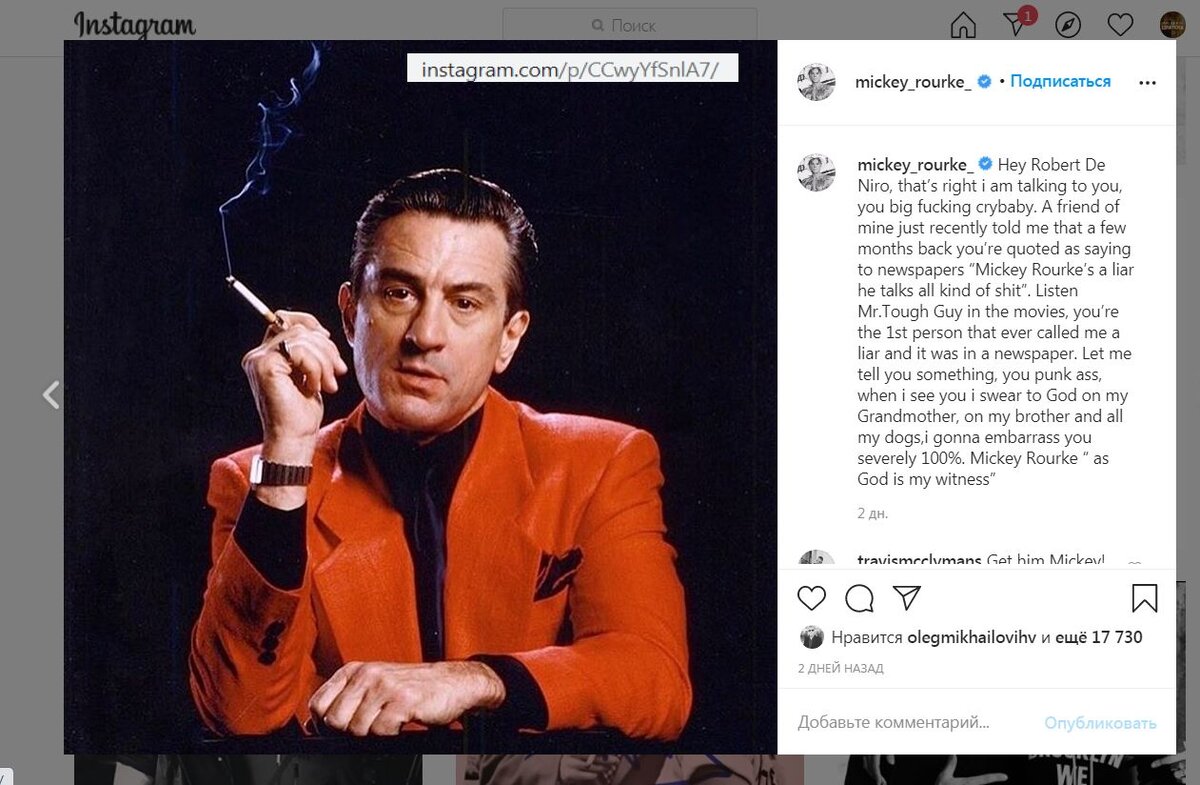 Недавно в инстаграме Микки Рурка появился вот такой пост: "Эй, Роберт Де Ниро, большой гр@@@аный плакса. Ты опять говоришь обо мне в газетах, что Микки Рурк-лжец, что я говорю всякую чушь. Ты сам-то крутой только в кино. Ты первый человек, который назвал меня лжецом, публично. Но придёт и моё время, клянусь я опозорю и тебя прилюдно, на 100%." Что же происходит у старичков? Пост — реакция на недавно вышедшую газетную статью Де Ниро, где он вскользь нелестно отзывается о Рурке. Оказывается, они действительно враждуют вот уже 30 лет. Все началось с конфликта на съемках готического триллера Алана Паркера "Сердце Ангела" (1987 г.) В то время Роберт Де Ниро был уже звездой, и вёл себя слишком высокомерно. Рурк вспоминал, что на съемках "Сердце Ангела" вёл себя надменно, эдаким королем, недотрогой, не желая даже разговаривать с молодыми актёрами. А Микки в то время был очень амбициозным, боксёром по жизни. Он всегда воевал со всеми. Видимо, "нашла коса на камень". Двум ярким и харизматичны