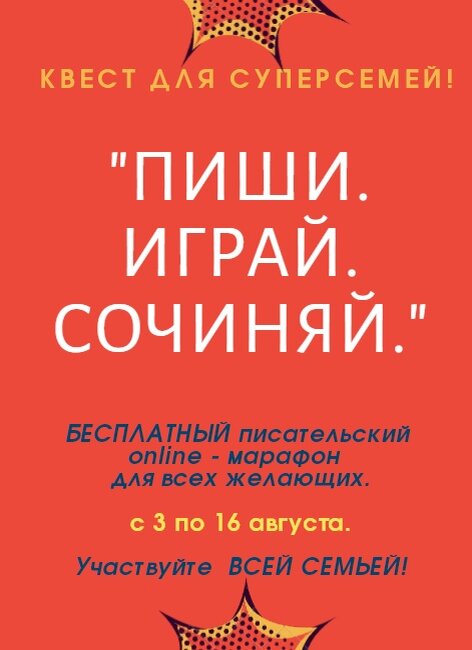 ~ Мечтаете научиться писать, как настоящий писатель, пройти онлайн-квест всей семьёй, не выходя из дома? Тогда участвуйте в летнем, семейном online-марафоне с 3 по 16 августа, и мы научим писать сочинения играя! Переходите по ссылке - и ваше семейное приключение начнётся