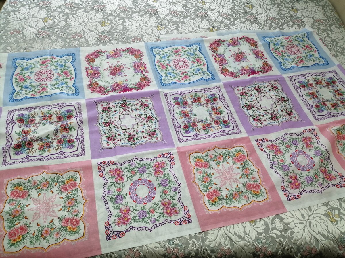 Готовые блоки для Пэчворк, по смешной цене. Шесть видов платков, в одном полотне на ситце, их размер 30*30 см, что как вы понимаете мало, для пошива одного одеяла, даже по ширине оно получается 90 см. Решила дополнить фоновой тканью и сшить несколько ярких блоков, для того, чтобы украсить и разнообразить готовые блоки из платков.