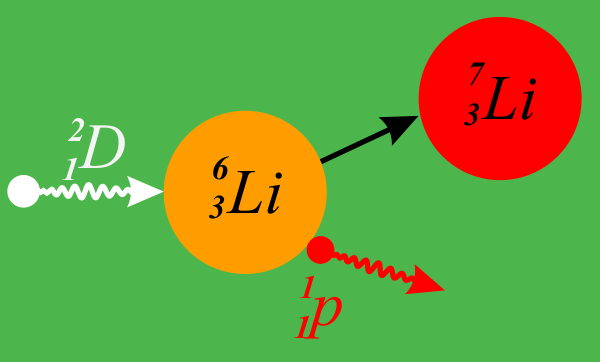 Тяжёлый изотоп водорода D(1,2) может вызвать превращение лёгкого изотопа лития Li(3,6) в тяжёлый Li(3,7). Какие частицы выделяются в результате этой реакции? // Ремизов А.Н., Максина А.Г. "Сборник задач по медицинской и биологической физике", 2001 г. https://bookmix.ru/bookprice.phtml?id=84492 Рисунок. Схема реакции, в результате которой литий-6 превращается в литий-7.