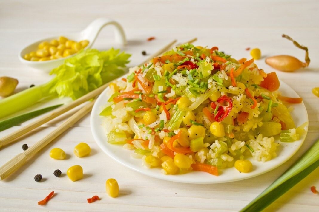 Нарезать мелким кубиком лук и мелко порубить чеснок, отправить обжариваться на сковороду. Как только лук приобретет слегка золотистый цвет добавить к нему оставшиеся овощи, кроме кукурузы, также нарезанные мелким кубиком. Обжаривать на большом огне непрерывно помешивая в течении 3 минут.