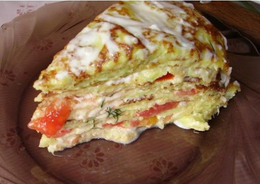 Корж намазываем соусом и выкладываем заранее порезанные помидоры колечками или полукольцами. И так перемазать весь торт. Сверху можно посыпать укропом.