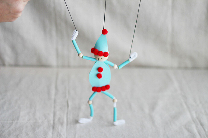Сегодня сделаем забавных марионеток из макаронин. Зовите детей. Все необходимое: Отрежьте кусочек эластичной веревки и наденьте одну большую бусину из дерева и одну маленькую. Это будет голова марионетки. Согните два ершика пополам и расположите их так, как показано на картинке ниже. Затем расположите макаронины вдоль ершиков, перемежая их с маленькими бусинами. Это наша заготовка. Теперь нам нужно покрасить макаронины в выбранный цвет. У нас он голубой. После того как краска высохнет, сделайте марионетке руки, надев на ершики макаронины и бусины. На концах рук сделайте петельки, чтобы закрепить конструкцию. С ногами поступите также. К нитке с бусинами-головой прикрепите ершик-руки, обвязав его нитью, затем наденьте на нитку 3 макаронины, после чего зафиксируйте ноги. Из бумаги или картона того же цвета, что и макаронины вырежьте шляпу для марионетки и костюм. Приклейте шляпу к маленькой бусине на голове и костюм к корпусу куклы при помощи термоклея. Нарисуйте маркером личико. В качес