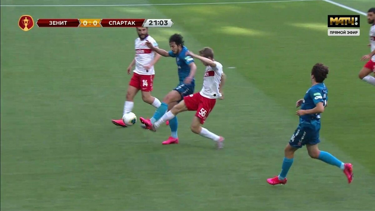 Гораздо интереснее эпизод у противоположных ворота при счете 0:0 на 9-й минуте. Вернее, его трактовка. В нем борьбу за позицию ведут Жирков и Соболев. Видео из-за авторских прав мы показать не можем, но и по стоп-кадрам многое понятно.