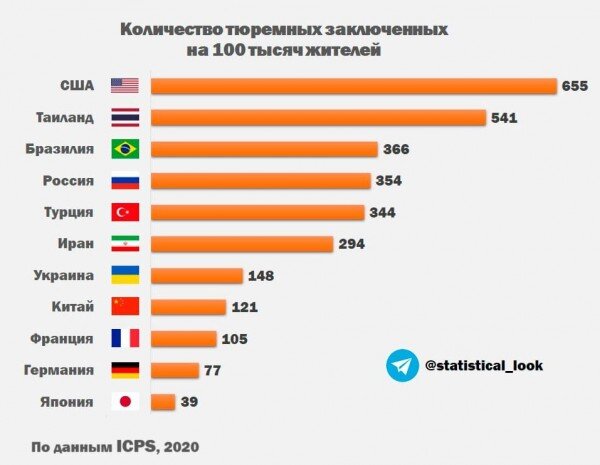 Для сравнения, в России под заключением находятся 511 тысяч человек, В Бразилии 746 тысяч, а в Таиланде почти 368 тысяч.