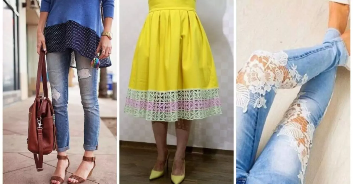 Сегодня в моде юбки или платья с имитацией удлиненного подола. Что ж, это модницам на руку. Можно найти в шкафу надоевшую вещь и при помощи удлинения превратить ее в новую. Например, можно использовать аппликации из прозрачного материала для подола юбок. Простейший способ: добавить ткань или же кружево по краю подола. Контрастные вставки с орнаментом. Таким образом, вы можете удлинить брюки, шорты, вшивая кружева или разные вставки по нижнему краю. Особенная трансформация деталей — вставки с орнаментом. Вставки здесь находятся в середине. Превращение джинсов в нечто оригинальное придется по вкусу дамам, которые предпочитают спортивный стиль. Для свитеров, кардиганов есть много возможностей. Наиболее распространенным является удлинение нижнего края изделия. Вы можете нарастить как низ, так и середину. Кружево можно заменить на контрастные непрозрачные материалы.