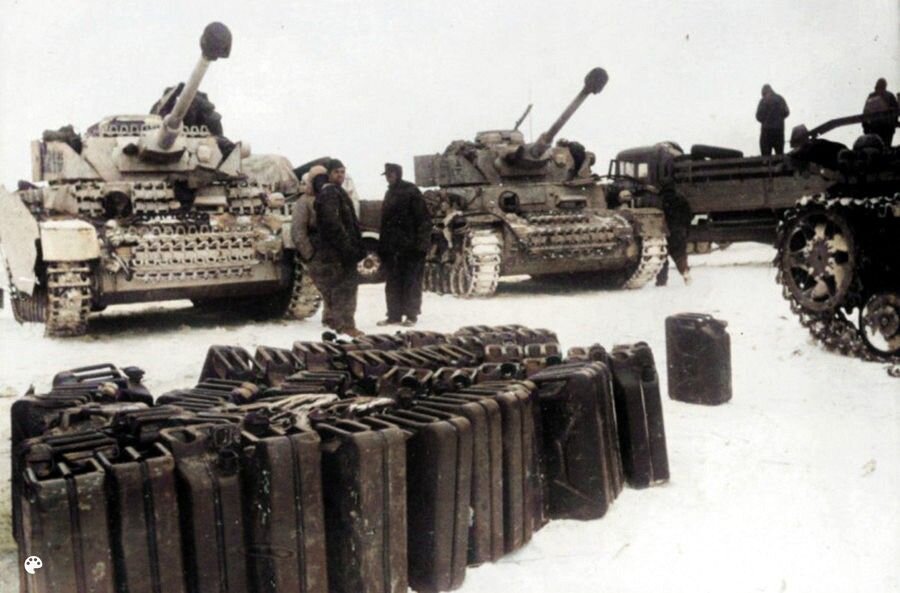 Немецкий средний танк Т-4 имел три топливных баках, общим объемом в 420 литров. При этом, бензин он ел хоть так: во время движения по шоссе расход был в 330 литров, а по бездорожью в 500 литров, т.е даже 100 километров не удастся проехать нормально. У немецкой «Пантеры» тоже все было очень прожорливо: на 100 километров она употребляла 595 литров, тогда как советский тяжелый танк по пересеченной местности потреблял 440 литров. И тем самым, немецкие танки очень хорошо поедали топливо, и учитывая их слабую нефтепромышленность это уже приговор.