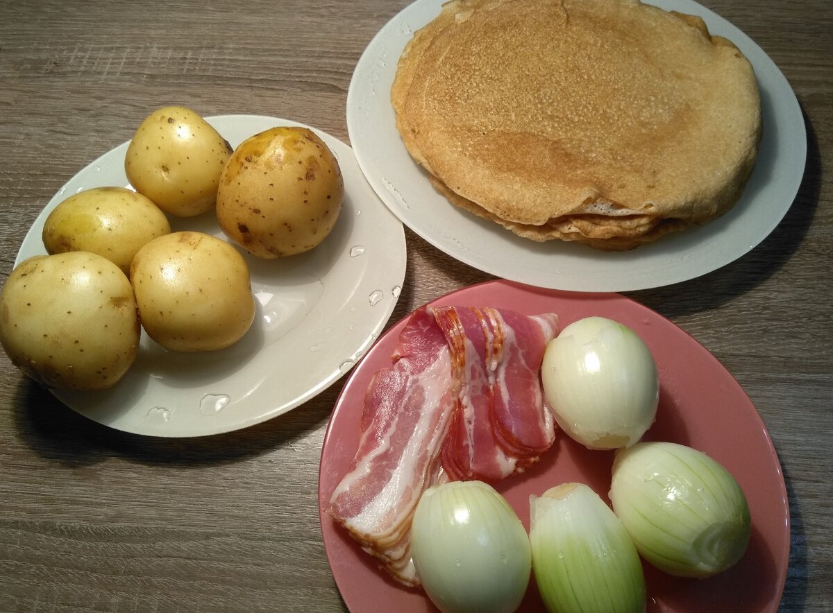 Блинчики с начинкой из картофеля, жареного лука и бекона.