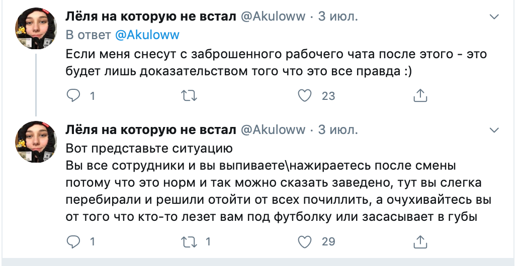 В этот раз все тоже началось с треда в твиттере. Бывший работник «Южной рюмочной» Егор Хорошилов рассказал о плохих условиях работы в «Зинзивере», «Южной рюмочной», «Барке», «Дежурной рюмочной» и «Бумажной фабрике». Все эти заведения принадлежат одному человеку — Дмитрию Ицковичу. По словам Хорошилова, менеджеры и управляющие рюмочных плохо общались с работниками, не давали выходных и системно приставали к барледи.