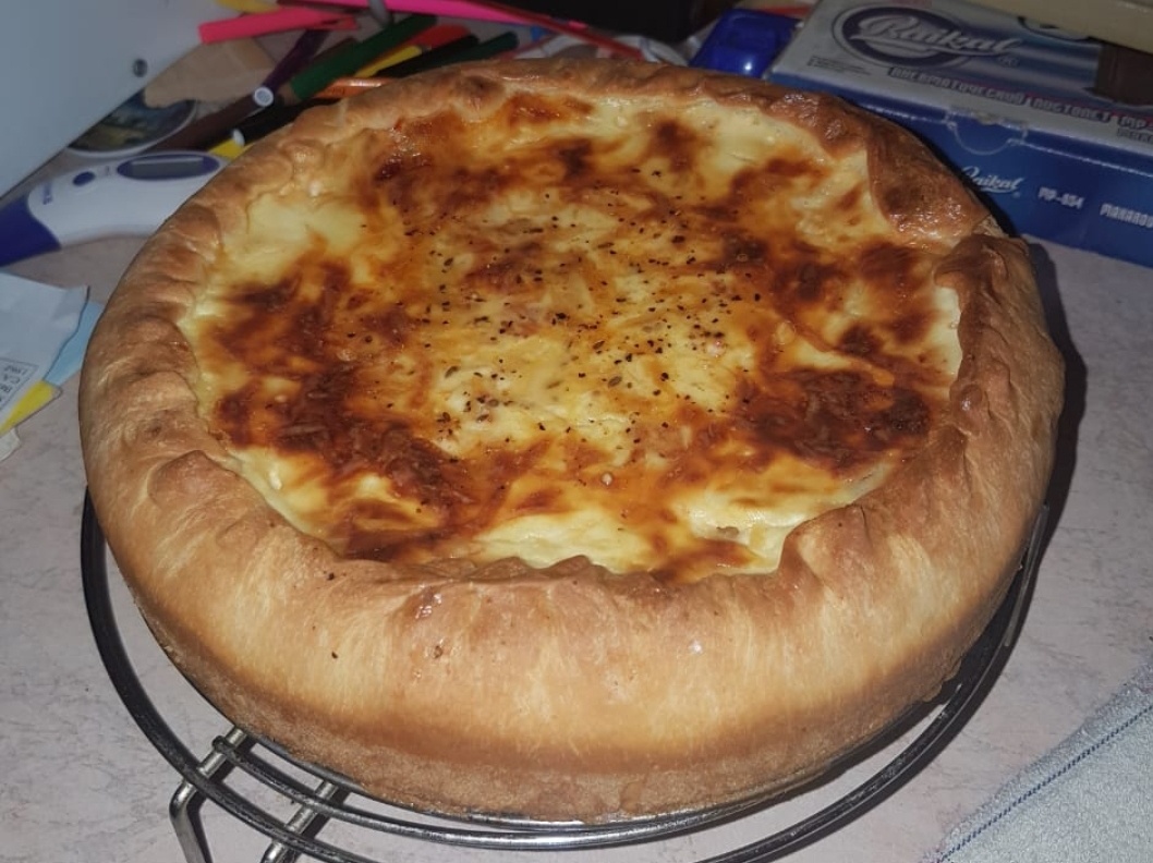 Готовится элементарно и съедается моментально! Что нужно: Для теста: Согреваем молоко, добавляем все ингредиенты и замешиваем тесто. Оставляем в теплом месте. Но самое главное! Это начинка: Лук - 5 головок Грудинка или карбонат- 150 гр Сметана или майонез - 2 ст. ложки Кетчуп или томатная паста - 2 ст. ложки Яйцо - 1 шт. Обжариваем грудинку, потом добавляем лук, порезанный кольцами, и тушим вместе 20 минут. Далее выкладываем на форму тесто, смазываем кетчупом тесто, сверху нашу начинку и поливаем заливкой (яйцо+сметана). Далее в духовку на 20 минут при 200 градусах, до золотистой корочки. Очень необычный и сытный пирог!