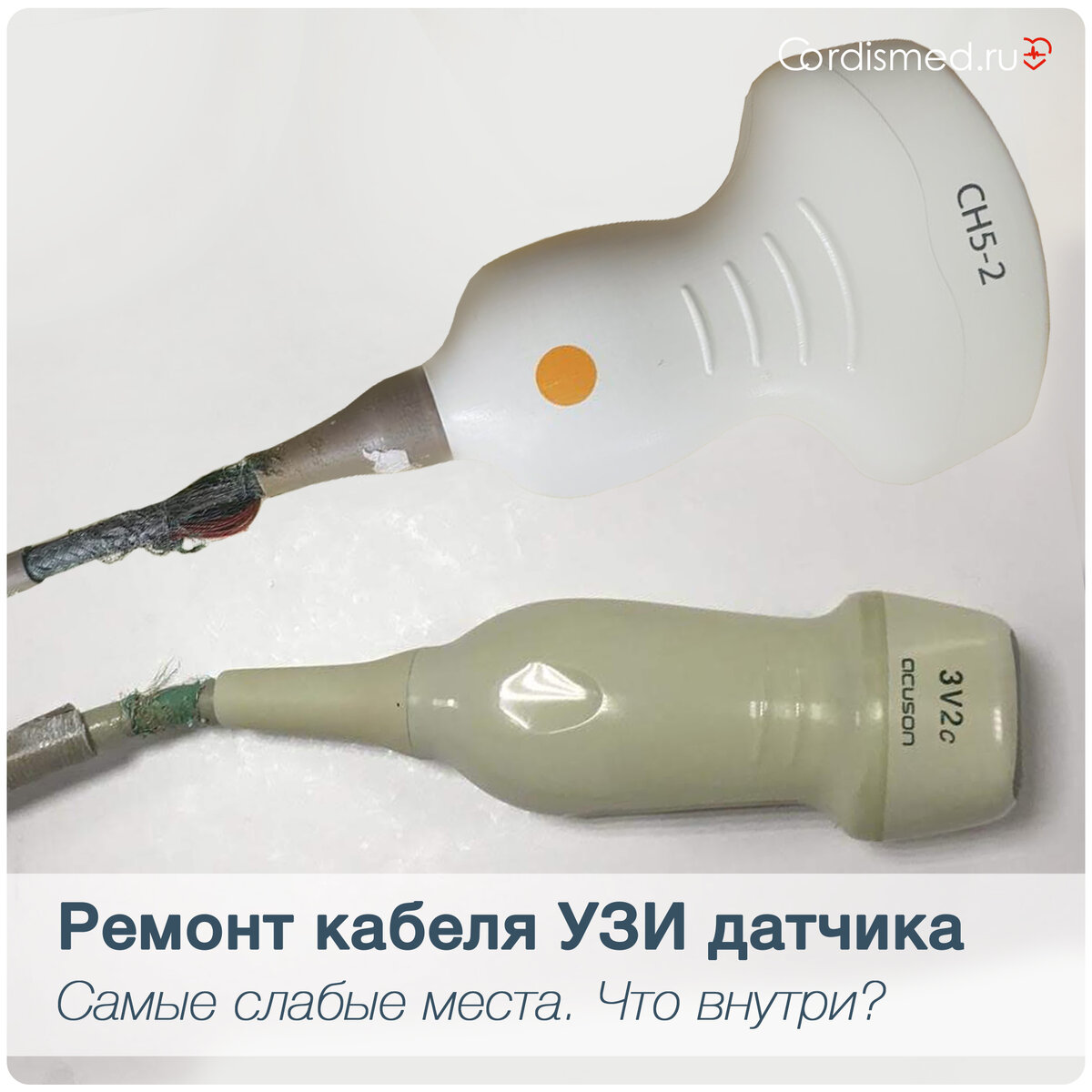 ✅ Под толстой оболочкой и изоляционным экраном-оплеткой от 90 микропроводников (фото 2-3). Они все очень и очень тонкие (но в норме довольно прочные) ✅ Почему кабель УЗИ датчика может выйти из строя? 🔹 Сильное скручивание / растяжение / неправильное хранение 🔹 Обработка агрессивными веществами (длительное время) 🔹 Повреждение манжеты (Strain Relief) у корпуса датчика или коннектора 🔹 Попадание под шасси УЗИ аппарата / медицинских тележек и т.д. 🔹 Ножницы? (Однажды столкнулись с тем, что при неизвестных обстоятельствах кабель датчика перерезали пополам хирургическим ножницами. Лучше, конечно, так не делать:) ..но всякое бывает. ✅ Как проявляется неисправность с кабелем датчика? 🔹 Когда берете датчик в руку и/или касаетесь линзы - возникают помехи (вертикальные полосы, лучше видны в цвете, см. пост от 28-05-2020 в нашем профиле - подробно писали про симптомы и диагностику. 🔹 Могут появляться и пропадать черные провалы в картинке при изгибе кабеля. ✅ Как избежать проблем с кабе