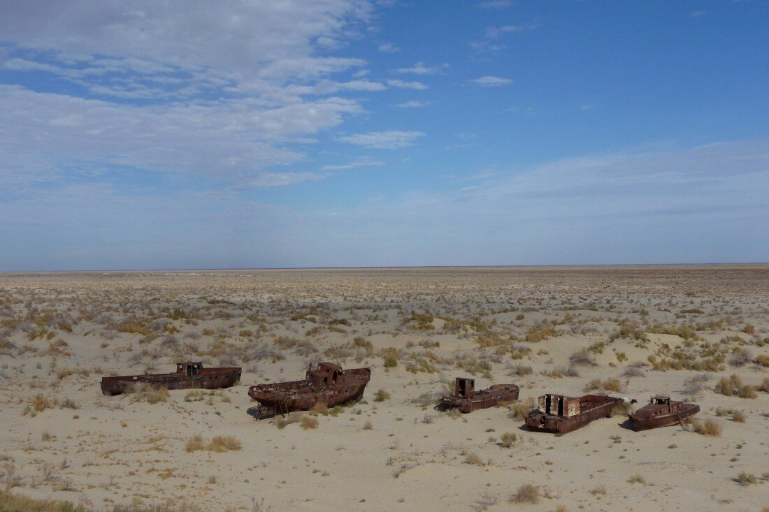 Сложно поверить в то, что на месте раскалённой засушливой пустыни, когда-то было самое настоящее море, занимавшее четвертое место в мире по своей величине. По нему плавали большие рыболовные судна, его волны бились о прибрежные скалы, а на его пляжи приезжали сотни туристов, чтобы поплавать и позагорать. С одной стороны – Каракум, с другой стороны – Кызылкум, а между ними Аральское море, точнее его дно. Сейчас это место называют Аралкум или Новая пустыня, и занимает она 54 тысячи квадратных метров. Здесь навечно причалены десятки кораблей, медленно превращаясь в ржавеющее кладбище. Проходя от корабля к баркасу невольно приходит осознание того, что у каждого судна была своя история, был свой капитан. А теперь – это кладбище кораблей, напоминающее антиутопический пейзаж. Все это увидеть можно в городе Муйнак, на южном берегу Аральского моря. Полвека назад здесь был крупнейший в Узбекистане порт, куда приходили рыболовецкие судна, где работал крупнейший рыбокомбинат, а многочисленные п