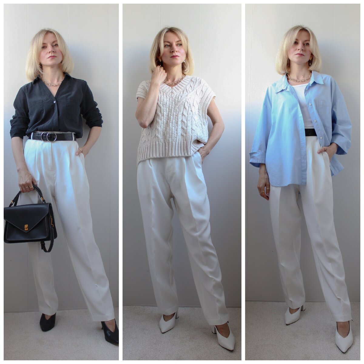 Так, в первых трех моих образах доминируют брюки свободного кроя. Да, они не подчеркивают особенности фигуры и выглядят весьма расслабленно, но при этом хорошо сидят, не полнят и за счет завышенной талии вытягивают силуэт. Я подобрала к ним разные варианты верха. Как видите, рубашка отлично смотрится как самостоятельная единица, так и в качестве второго слоя. На ее месте, кстати, мог бы быть удлиненный кафтан из тонкой полупрозрачной ткани. Обратите внимание, что во втором образе открыты руки. Несмотря на то, что в силуэте «нет талии», за счет правильной длины вязаного жилета пропорции фигуры уравновешены.