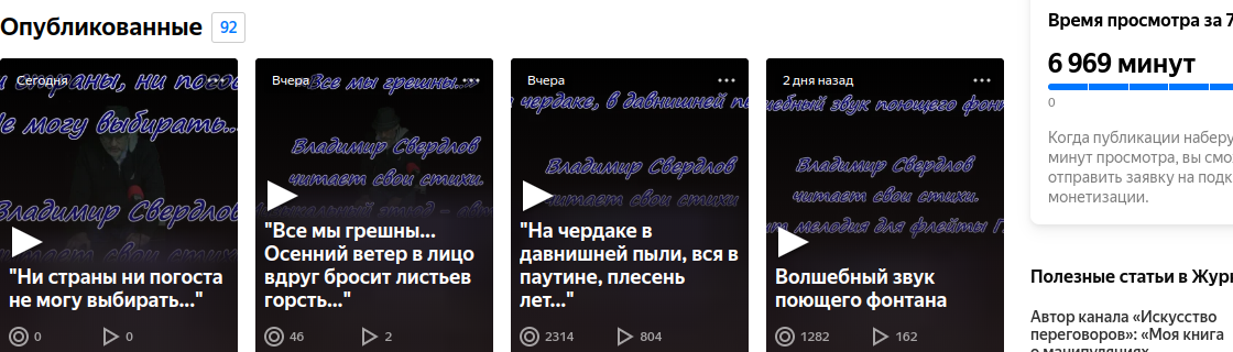 1. Введение в проблему. Моему каналу 3 месяца. Канал узкоспецифичный: авторское чтение стихов. Соответственно, это - а. ролики (настоящая публикация - только второй текст на канале) и б. очень узкая (я бы сказал: камерная) аудитория (по сравнению с другими каналами). Дополнительно: Как все знают, когда время просмотра за неделю достигает 10 тыс мин, появляется право подать заявку на монетизацию. Я изначально не собирался это делать, что и указал при создании канала, но это не суть важно. Важна цифра 10 тыс. Ещё дополнительно. Я начал с двух роликов в день, но сейчас перешёл на один ролик в день. Это важно для понимания периодичности публикаций. 2. Методика. В качестве объективного, простого и удобного критерия возьмём время просмотра всех материалов канала за неделю. Это удобно во всех отношениях и к тому же этот параметер можно отслеживать чуть ли не в реальном времени. Итак, возьмём его. 3. Исходные данные. Моё обычное (нормальное) медианное время просмотра колебалось где-то в рай