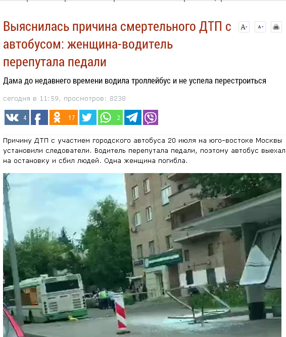 Об этом страшно и ужасно говорить, но, по факту, косвенно из-за уничтожения троллейбуса начали гибнуть люди. Сегодня 20 июля на Ставропольской улице с автобусом "Мосгортранса" произошло ДТП: водитель не справилась с управлением и въехала в остановку, где стояли пассажиры. Одна женщина погибла... "Ну ты вообще уже охренел, автор, ДТП с автобусами к закрытию троллейбусов подстёгивать! Совесть у тебя, вообще, есть?". Казалось бы, какое отношение авария с автобусом имеет к твоим троллейбусам? Оказывается, самое, что ни на есть. прямое. Троллейбусы в спешке заменяются на автобусы, но те из воздуха не берутся! А особенно из воздуха не берутся водители для них. Существующие маршруты надо как-то обслуживать, а тут ещё новых подвалило. Напомню, что автобусных парков за эти годы больше не стало! Наоборот, их даже стало меньше на один. А троллейбусных парков было закрыто три штуки без какой-либо компенсации. На что легла нагрузка? Правильно, на оставшиеся парки. Я уже давал здесь рассказ о будн