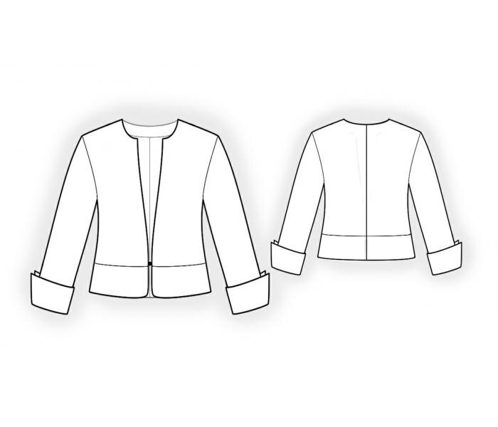 7. Стачать и разутюжить плечевые срезы подборта и обтачки. Втачать подборт и обтачку в подкладку жакета. Припуски заутюжить на подкладку. Стачать средний и боковые срезы нижних частей. Притачать нижние части к подкладке. Подборт положить на лицевую сторону полочки лицевой стороной вниз и обтачать вдоль борта, по горловине и по нижнему срезу. Обтачивание выполняют со стороны полочки. Притачать подкладку к внутреннему срезу манжеты. Вывернуть жакет через отверстие в рукаве. Стачать отверстие в рукаве. Проложить скрепляющую строчку в шов притачивания манжеты.