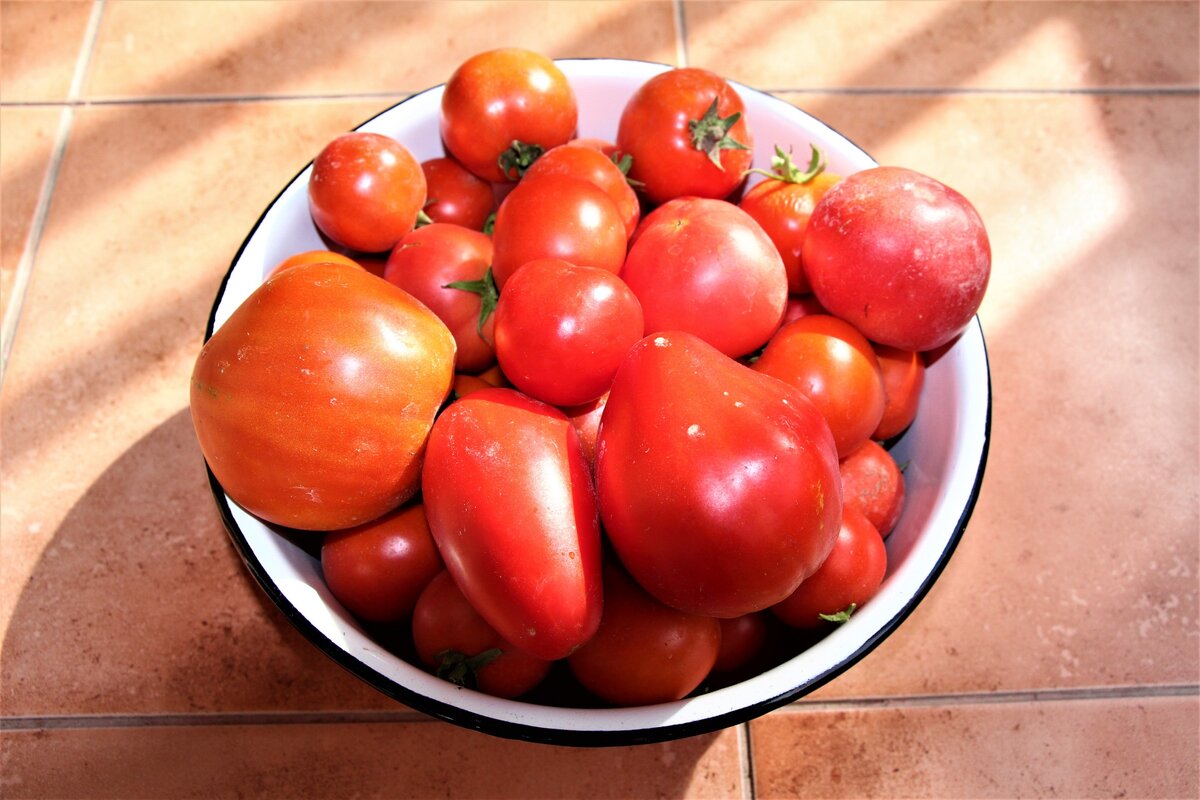 Это вчера утром мы сняли часть покрасневших от солнца помидор. Маленькие идут на зимнюю закатку. Вчера нам друзья-соседи дали кучу маленьких банок, теперь Светлана будет закатывать банки на раз-два поесть, зимой естественно. Помидоры просто по вкусу обалденно. Большие мы кушаем сейчас.