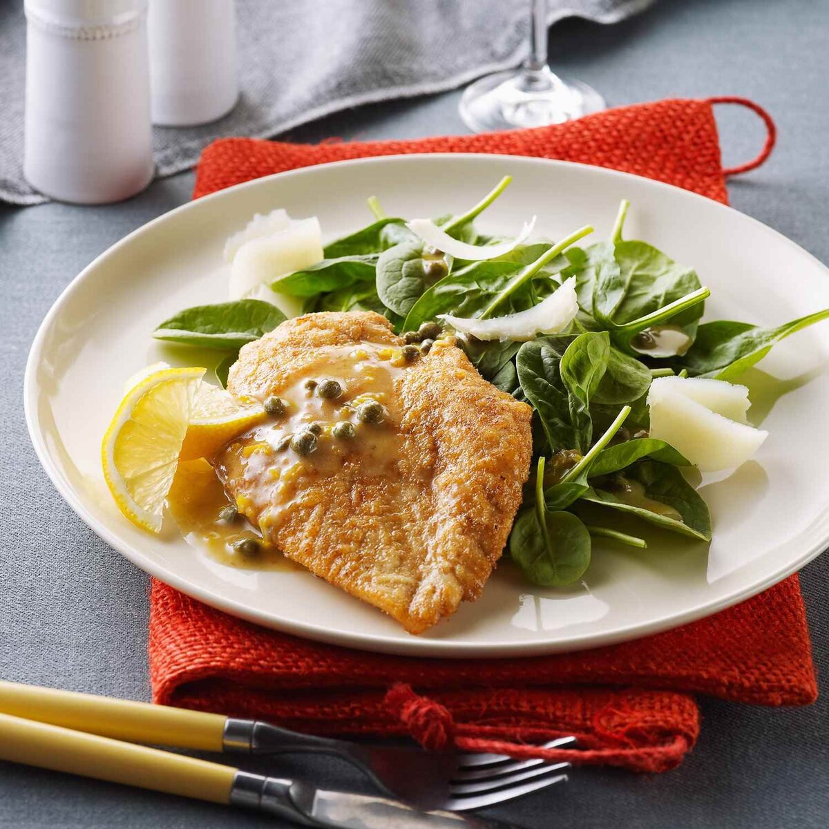 Ингредиенты: куриная грудка: 4 Штуки, соль: 1 Щепотка (по вкусу), мука: 4 Ст. ложки, сливочное масло: 5 Ст. ложек, оливковое масло: 4 Ст. ложки, лимон: 2 Штуки, сливки: 3/4 Стакана, петрушка: 1 Щепотка, макароны: 450 Грамм Приготовление: Довести воду в кастрюле до кипения. Отварить спагетти. Посыпать курочку специями. Обвалять куриные грудки в муке. В большой сковороде растопить сливочное и оливковое масло. Обжаривать куриные грудки в течении 3 минут на каждую сторону. Залить сухое белое вино в сковороду. Выжать лимонный сок. Смешать венчиком. Готовить в течении 2 минут. Затем влить сливки. Добавить щепотку петрушки. Готовую пасту выложить на тарелку вместе с куриной грудкой. Полить соусом и добавить немного петрушки. Приятного аппетита!