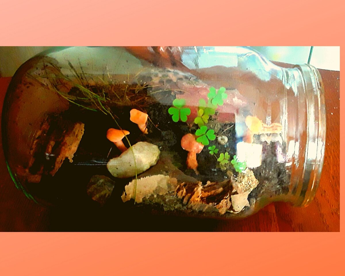 Что привлекает нас в миркро мирах, для меня остается загадкой. Но что-то манит нас заглянуть в эти «волшебные» прозрачные колбочки с различной растительностью и камушками. Так, и моя десятилетняя дочь в одном из цветочных магазинов буквально приклеилась к пластиковой прозрачной колбочке с каким-то мини кустиком и камушками. Вроде бы ничего особенного, но ребенка ведь не оторвать ! В этот раз я проявила твердость и вышла с дочкой из магазина без этой новой «забавы». -Мам можно мне взять какую-нибудь баночку?- на следующий день звонит мне на работу дочь. -Бери конечно, только не очень большую.- Разрешаю я. Я совсем забыла про колбочки из цветочного магазина и подумала, что банка нужна ей для очередного слайма. И вот, кода я пришла домой, то с удивлением обнаружила микро мир в обычной банке. Мох, трава, кора винограда, и что самое удивительное - там росли грибы! Вот как просто она это сделала: 1. Дно банки засыпала керамзитом, для дренажа. Это нужно обязательно сделать.