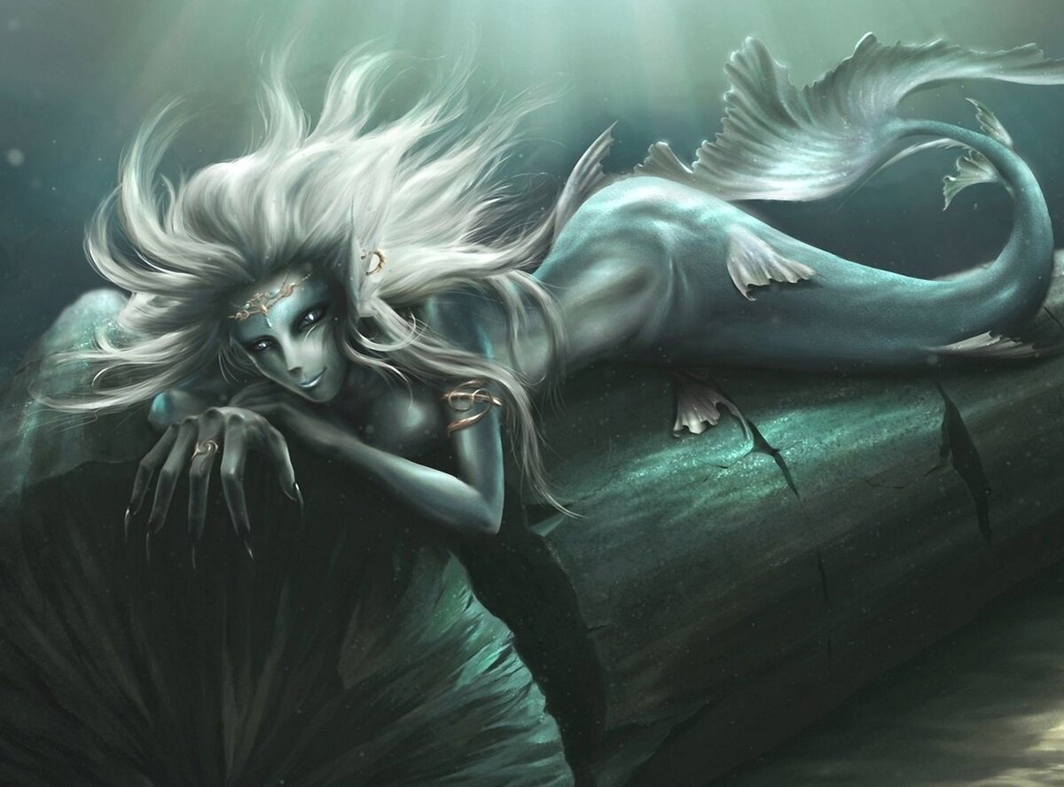 Грудь принца поднялась, а глаза открылись. И вот что они увидели: молодую женщину с очень бледной, почти прозрачной кожей, жесткими белыми волосами заплетенными в высокую прическу с помощью костяных заколок. Ниже живота ее лежал рыбий хвост - черный с изумрудным отливом, цвет его полностью совпадал с большими раскосыми глазами.