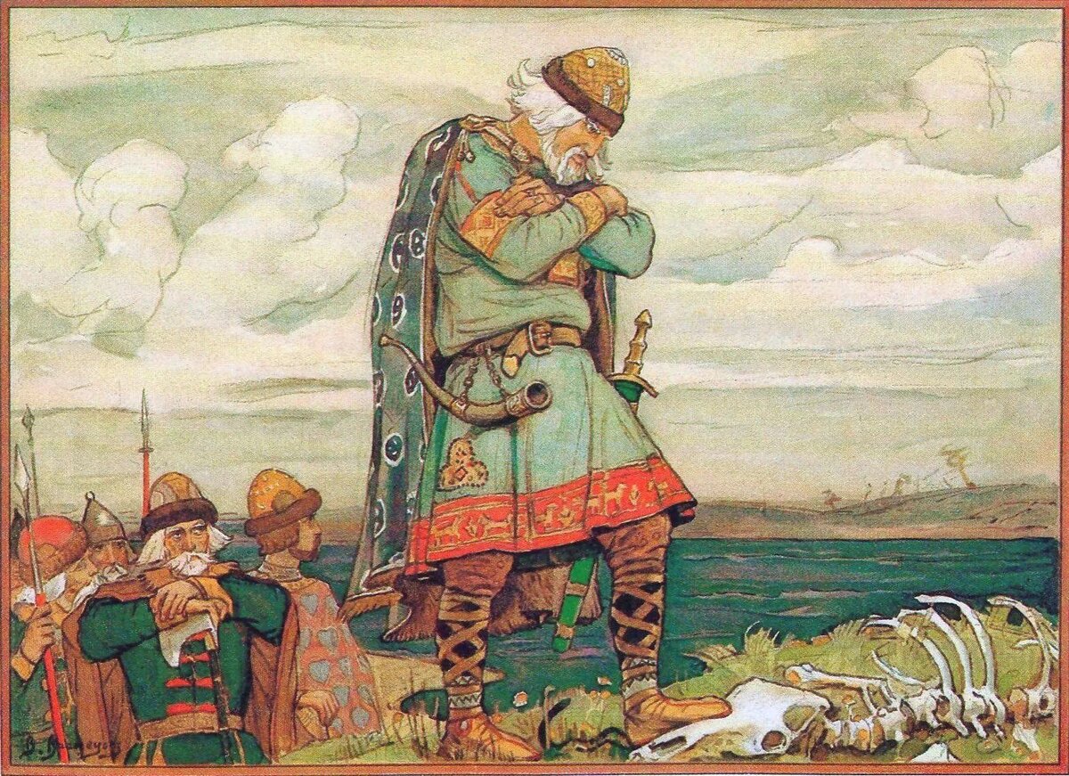 «Олег спросил кудесника: „Отчего ми есть умрем?“ И рече ему кудесник один: „Княже, конь, егоже любиши и ездиши на нем, от то и умрети“. Олег же приим въ уме, си рече: „Николи же всяду на нь, ни вижю его боле того“, и повелелъ кормити и не водити его к нему, и пребы неколико лет не виде его, дондеже на грекы иде. И пришедшу ему к Кыеву и пребывьшю 4 лета, на пятое лето помяну конь, от него же бяхуть рекл волсвли умрети, призва старейшину, конюхом, рече: „Како есть конь мой, его же бех поставил кормити и блюсти его?“ Он же рече: „Умерл есть“. Олег же посмеялся и укори куесника, реча: „То ти неправо глаголють волсви, но все ложь есть: конь умерлъ есть, а я живъ.“ И повелелъ оседлати конъ: „А то вижу кости его“. И приде на место, идеже беша лежаще кости его голы и лоб гол, и сседе коня, и посмеяся рече: „От сего ли лба смерть было взяти?“ И вступи ногою на лоб; и выникнувши змия изо лба и уклюну в ногу, и с того разболеся и умре».