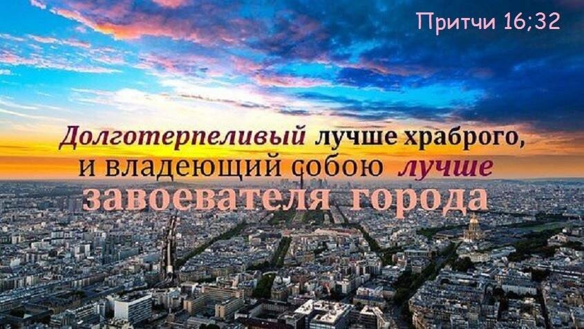 Соломон сказал, следуя Божьим указаниям: “Долготерпеливый лучше храброго, и владеющий собою лучше завоевателя города” (Прит. 16:32). Силу мы уважаем. Бог говорит, что истинным достижением для человека является победа над своим собственным духом. Лучше человеку укротить свой собственный дух, чем завоевать город. Соломон также писал: “Что город разрушенный, без стен, то человек, не владеющий духом своим” (Прит. 25:28).